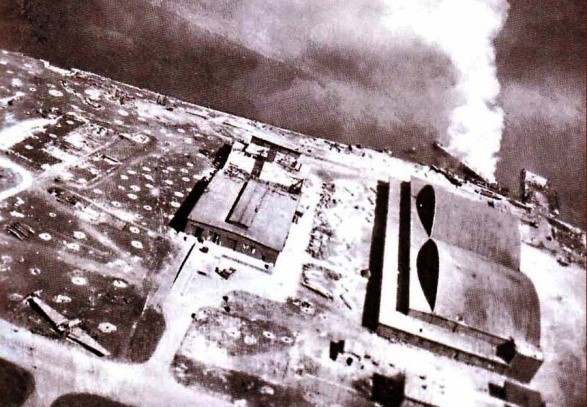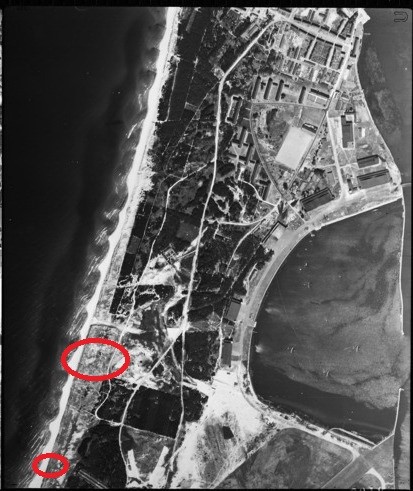 Аэрофотосъемка территории вокруг ангаров гидрогавани авиабазы «Нойтиф» бомбардировки советской авиацией. Именно в этом месте происходила высадка передового отряда под командованием гвардии майора А.В. Дорофеева.