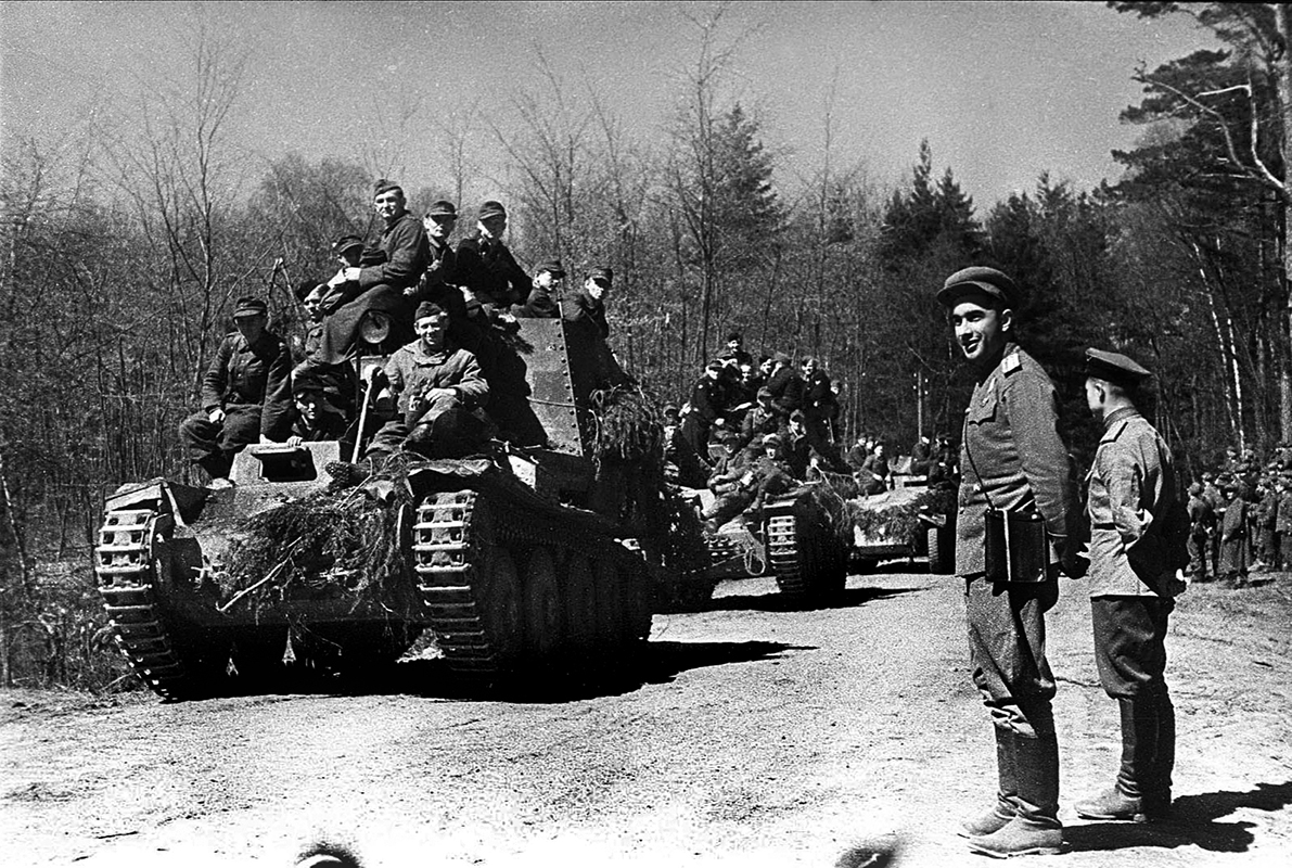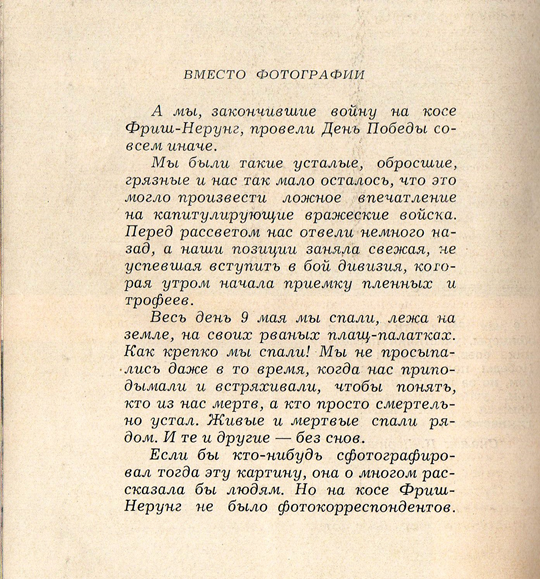 В течение двух дней шел прием пленных, вооружения и боевой техники. Радость победы над фашисткой чумой переполняла сердца всех. Эти мгновения на косе Фрише Нерунг запечатлели военные фотокорреспонденты Михаил Савинов и Марк Марков-Гринберг.
