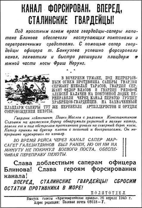 25.04 передовой отряд 3 сб гв. майора А.В. Дорофеева форсировал пролив Зее-Тиф и обеспечил высадку главных сил 5 гв.сд.