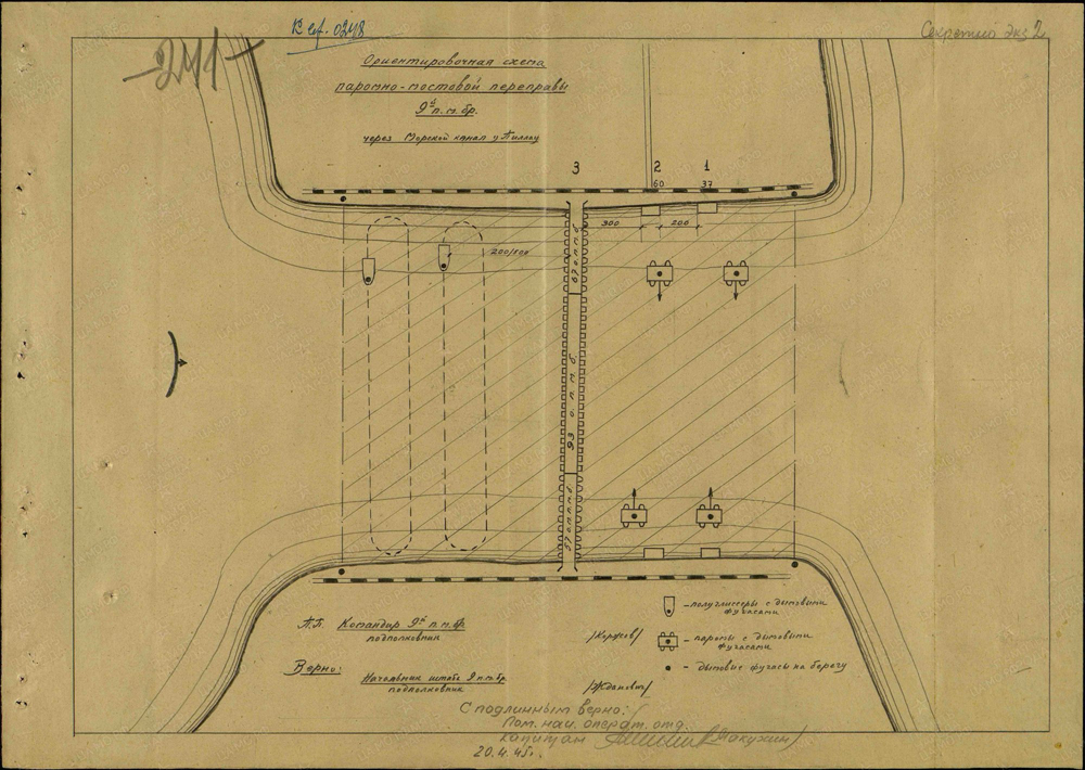 Ориентировочная схема понтонно-мостовой переправы 9 п.м. бр через морской канал Пиллау. 20.04.1945